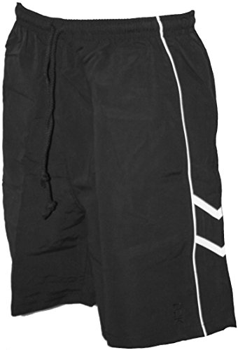 Black swim shorts with parallel white piping stripes & two white chevrons by D2K. These quality swim shorts have a handy pocket with a zip fastening on each side. They have a mesh inner lining & fasten with an elasticated drawer string waist. The fabric content is 100% polyester. Inside leg length is 7" or 18cm. This item is made for The Perfect Collection on the D2K label, a UK company who specialise in larger size clothing, they have their own factories & the quality of all the items is exceptional, please don't confuse it with any inferior brands. All the items we have advertised from this brand are well made from quality fabric, you will not be disappointed.